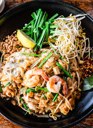 Rice stick noodle stir fried with beans sprouts, garlic chives, egg and crushed peanuts.